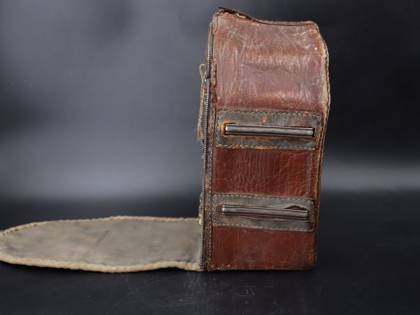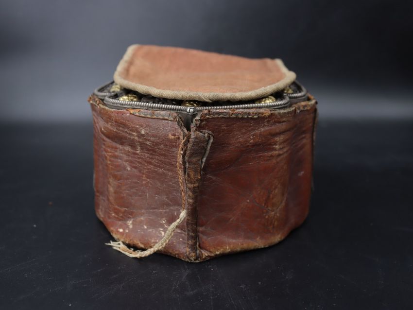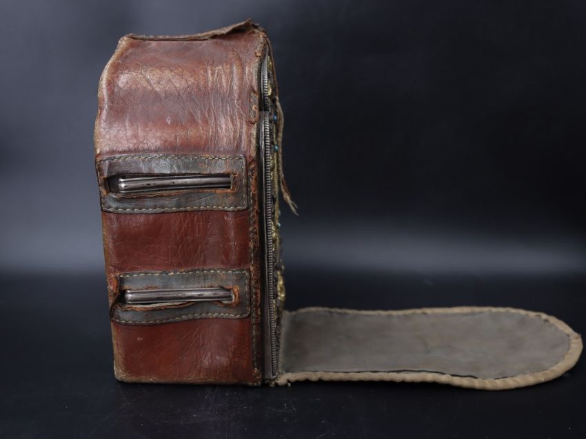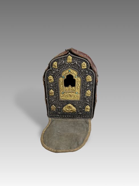 A Tibetan Copper Silver and Gilt 'Gau' Box. Ca. early 20th century.A copper and silver reliquary having a small central window, with intricate silver face plate decorated with stylised vine pattern with applied gilt copper decorative plaques of zoomorphic figures and symbols. Suspension loops on the sides. Stamped in the base with Helios/Made in Nepal and a stamped floral element. Complete with original leather and cloth travelling cover case. A well preserved and lovely example. Provenance: Ex American private collection since 1950's. Condition: Good overall. Size: 17x13cm Good overall.