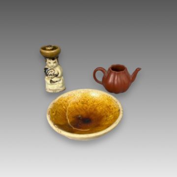 Three Ceramic Pieces, 19th century and earliercomprising a miniature Yixing teapot, an amber glazed pottery bowl, and a Cizhou type candlestick figure, the candlestick H:8cm.