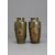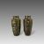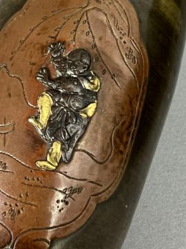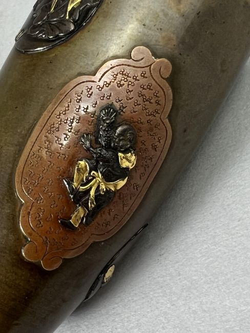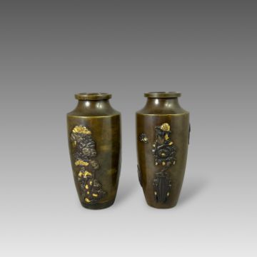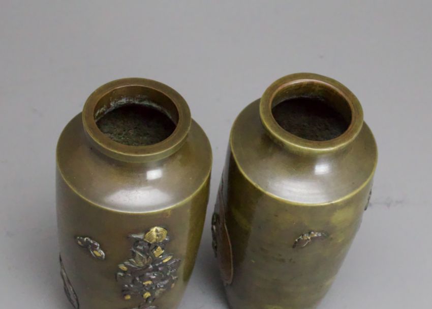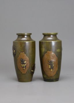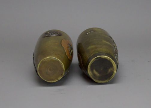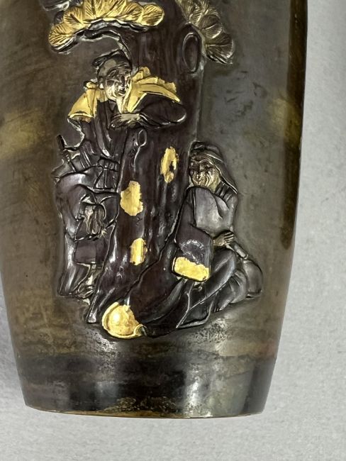 A small Pair of Japanese mixed metal Vases, Meiji periodthe sides decorated in low relief in gilt, shakudo and copper, each with differing scenes of mythical figures, beneath the angled shoulder, good condition H:12cm