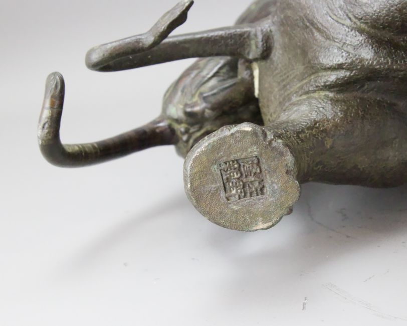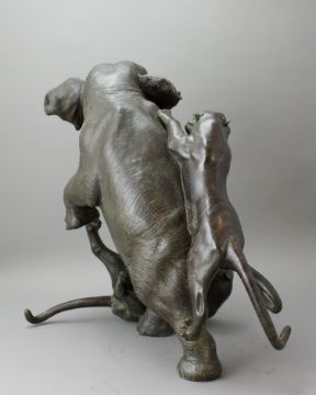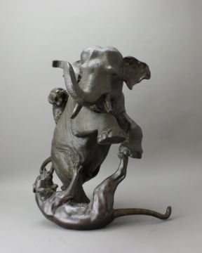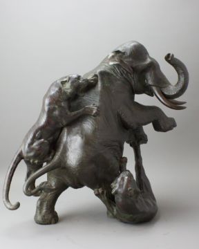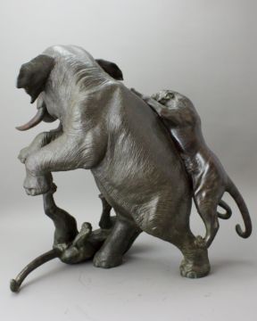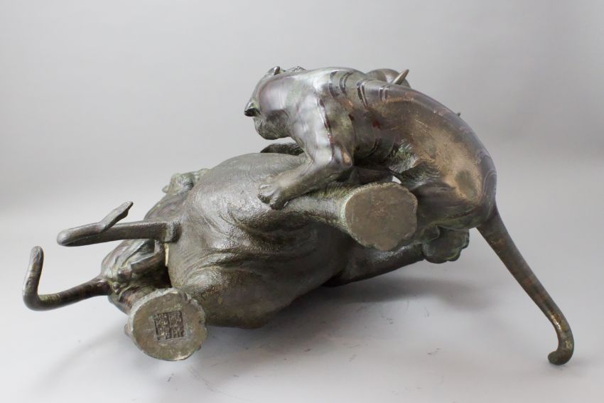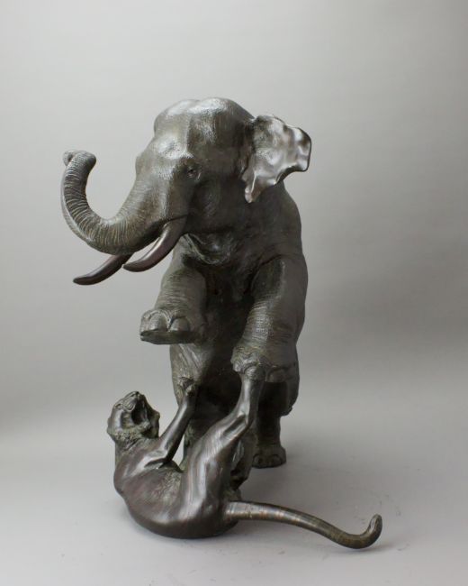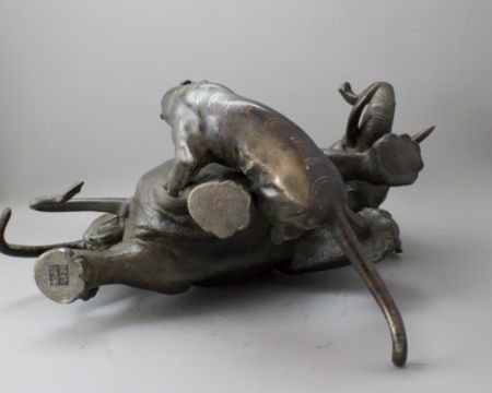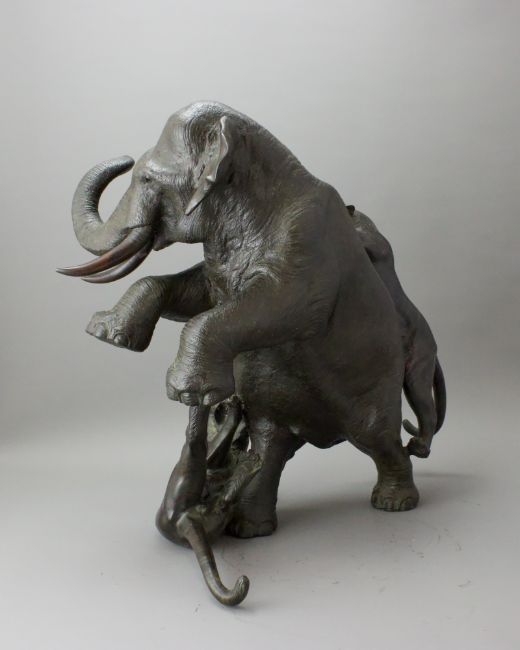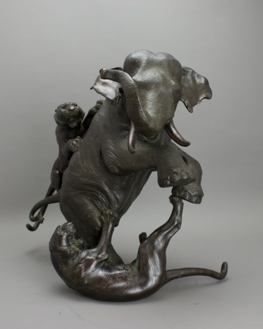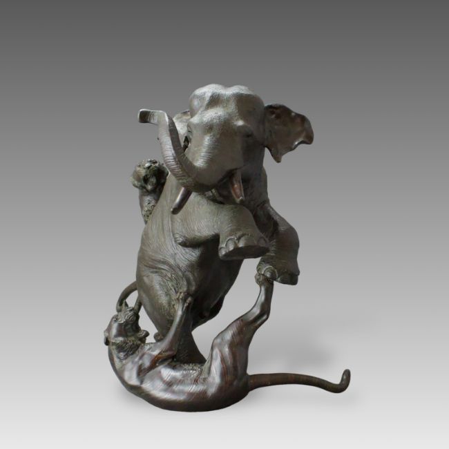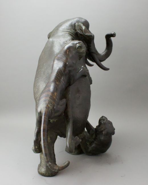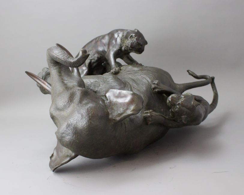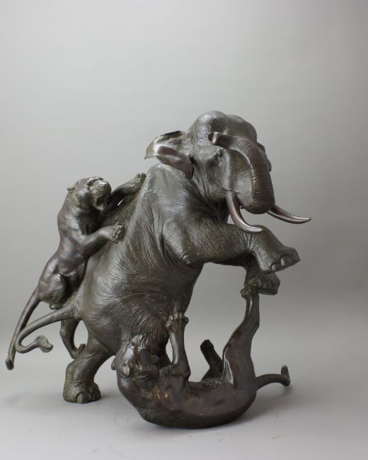 A Japanese Bronze Elephant and Tigers Group, Meiji period,with one seal, the enraged elephant in combat with two tigers, good dark patina H:38cm