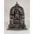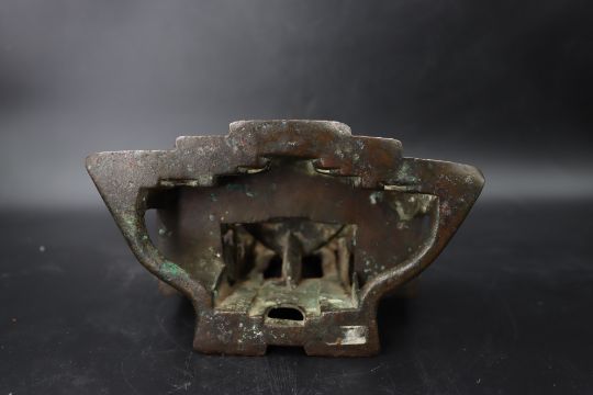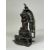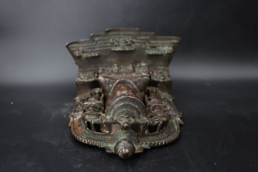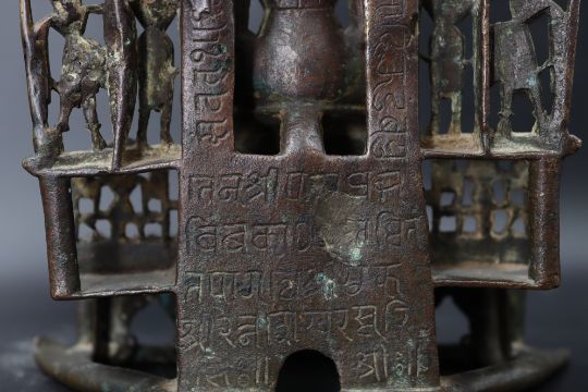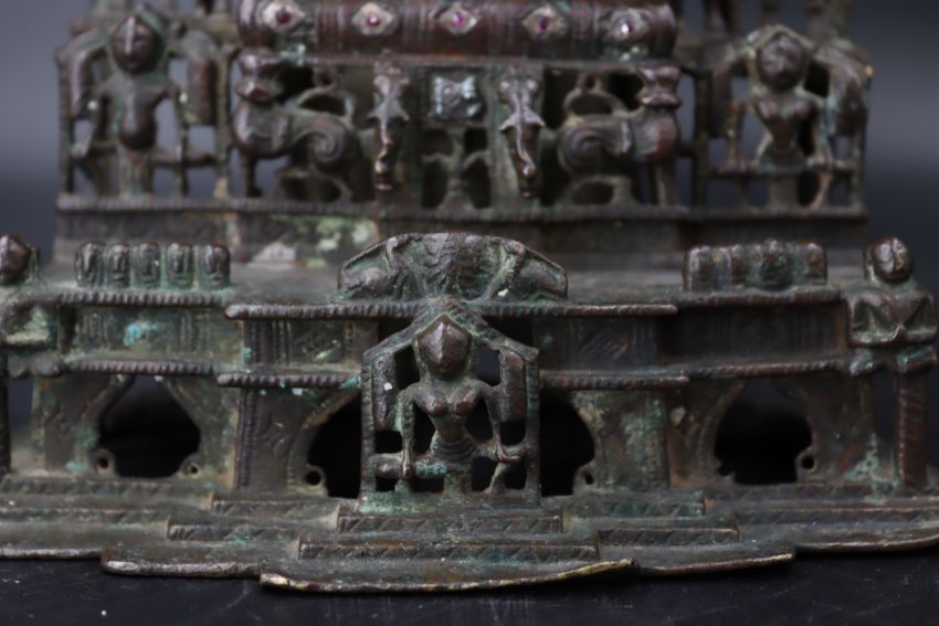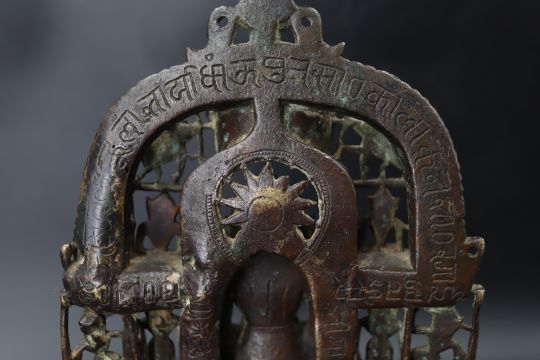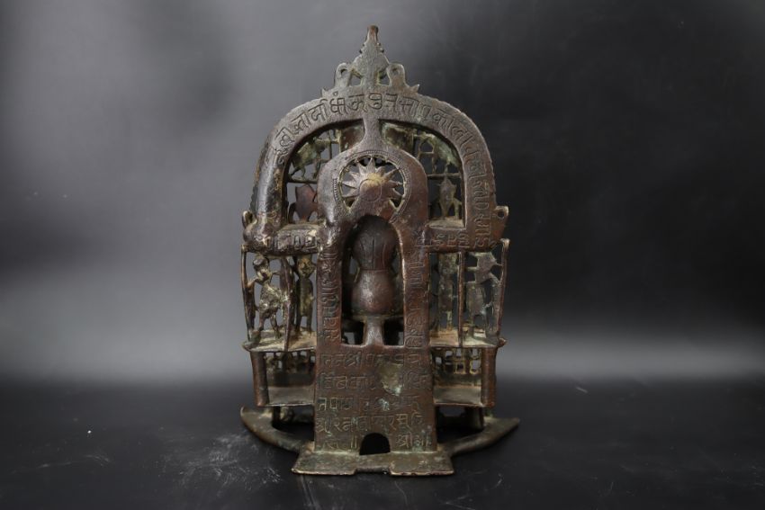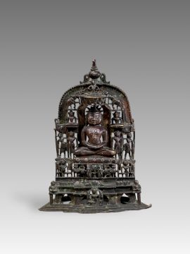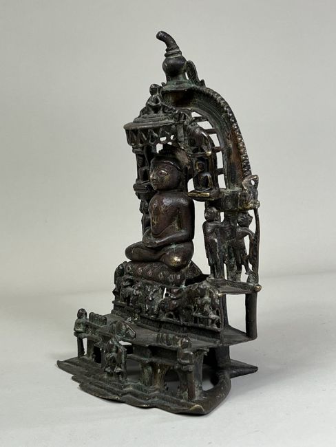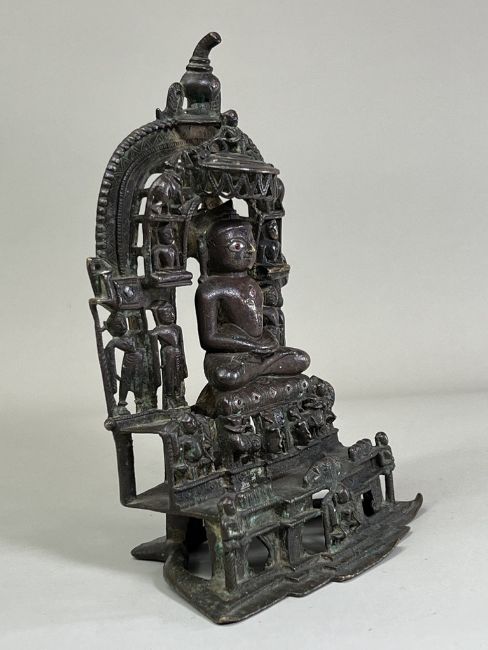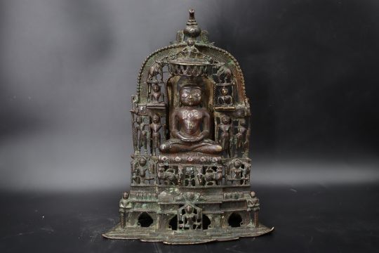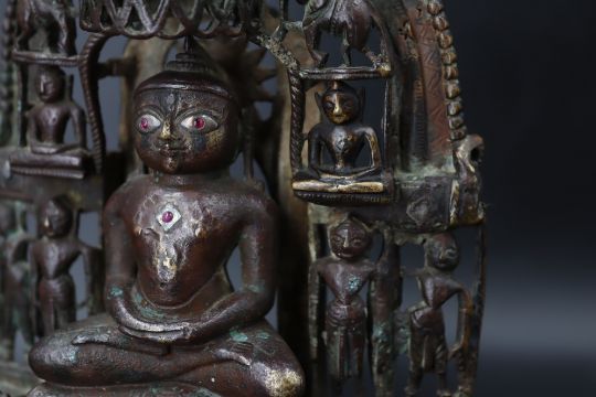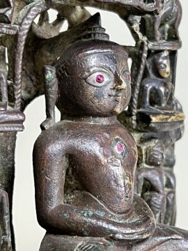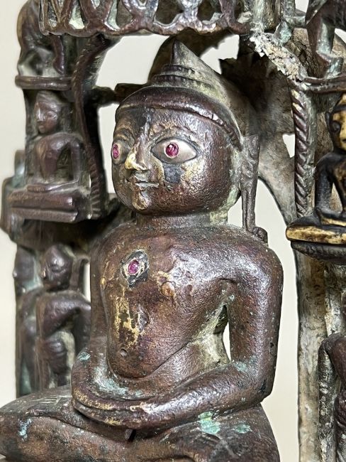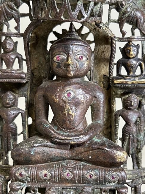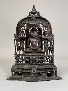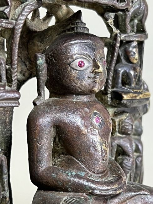 A Bronze Jain shrine with Rubies and Silver Inlay. India 15th century.A beautiful Jain bronze figure with attendants flanking the main figure, his eyes and throne cushion embellished with rubies and silver inserts, the back with Sanskrit text. Provenance: From a British private collection. Condition: Good overall, with dark brown and verdigris patina as expected, slight bumps at the front of the base. Size: 22x13cm Good overall, with dark brown and verdigris patina as expected, slight bumps at the front of the base.