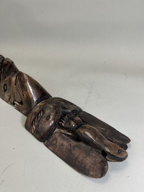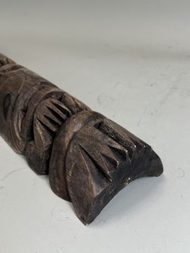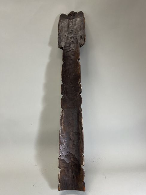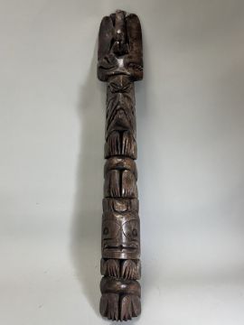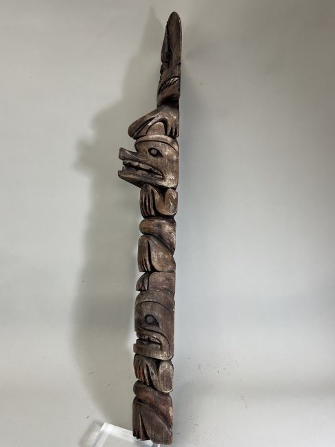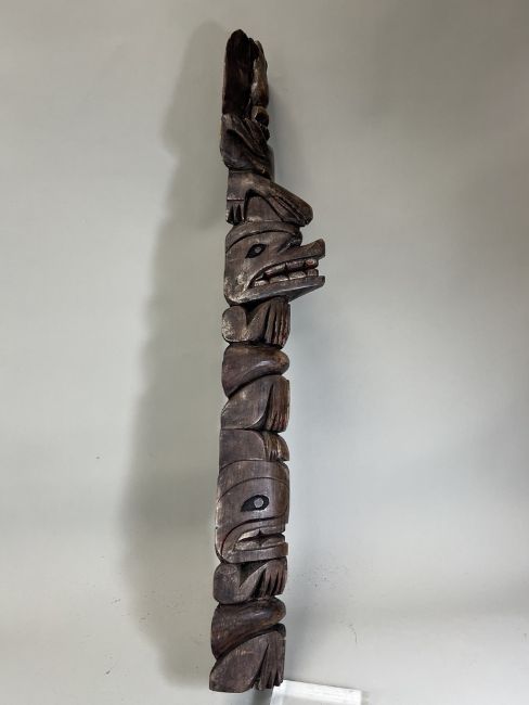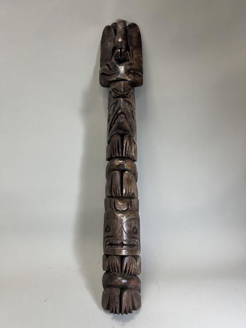 A model totem pole. Northwest Coast Canada.Carved in wood with a stacked arrangement of totemic animals, including an eagle, a whale, a frog, a wolf and a bear. Provenance: British private collection. Condition. Very good, some pigments. 81.5cm tall. Very good, with some pigments.