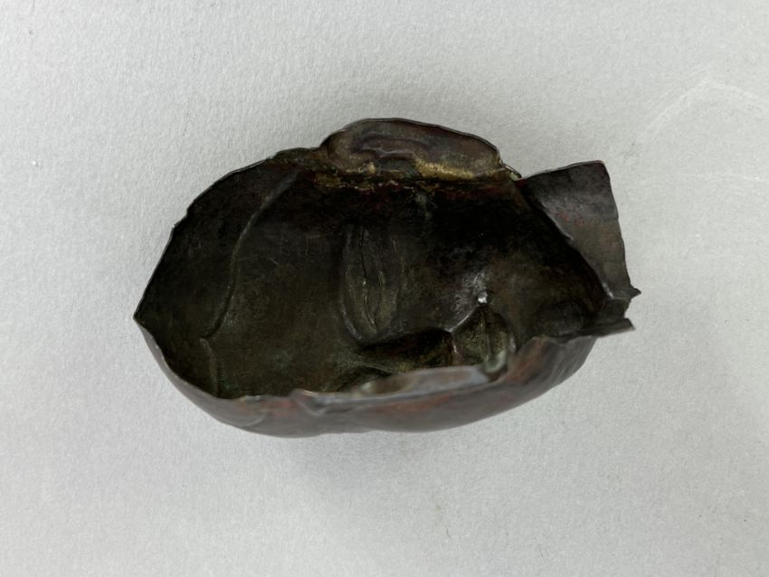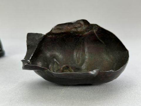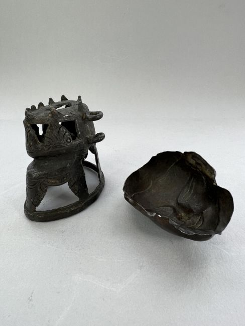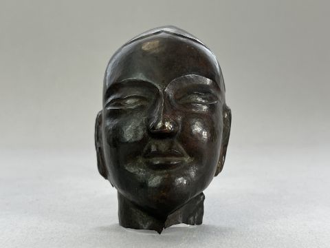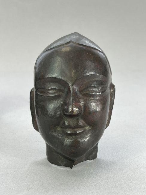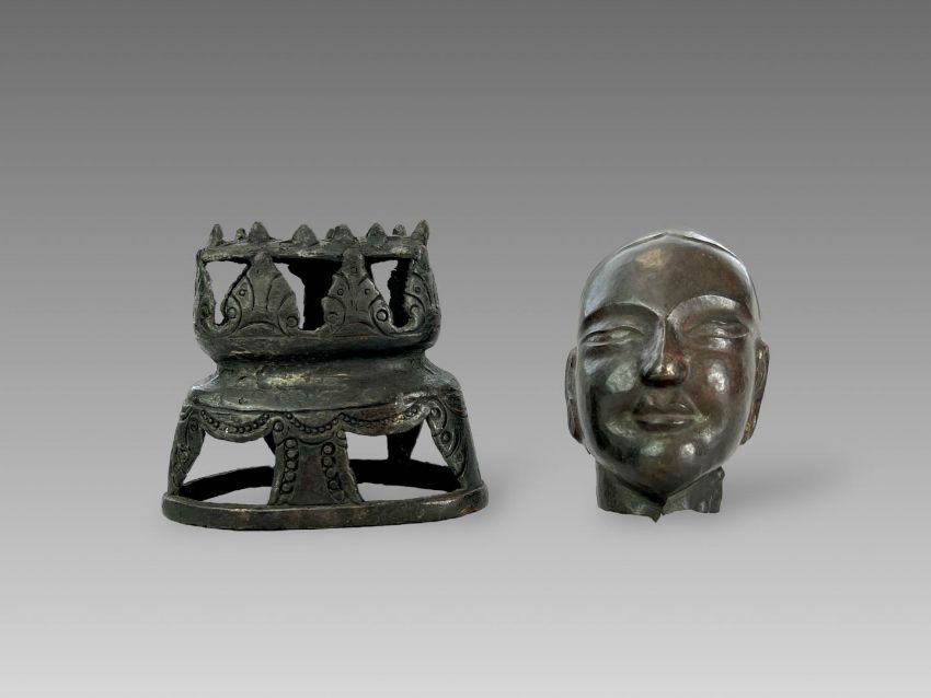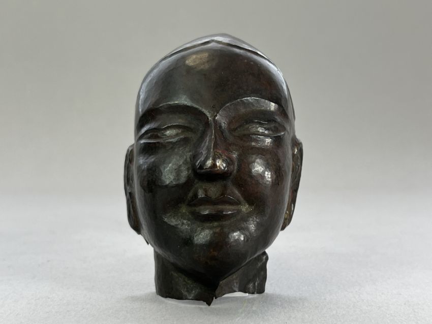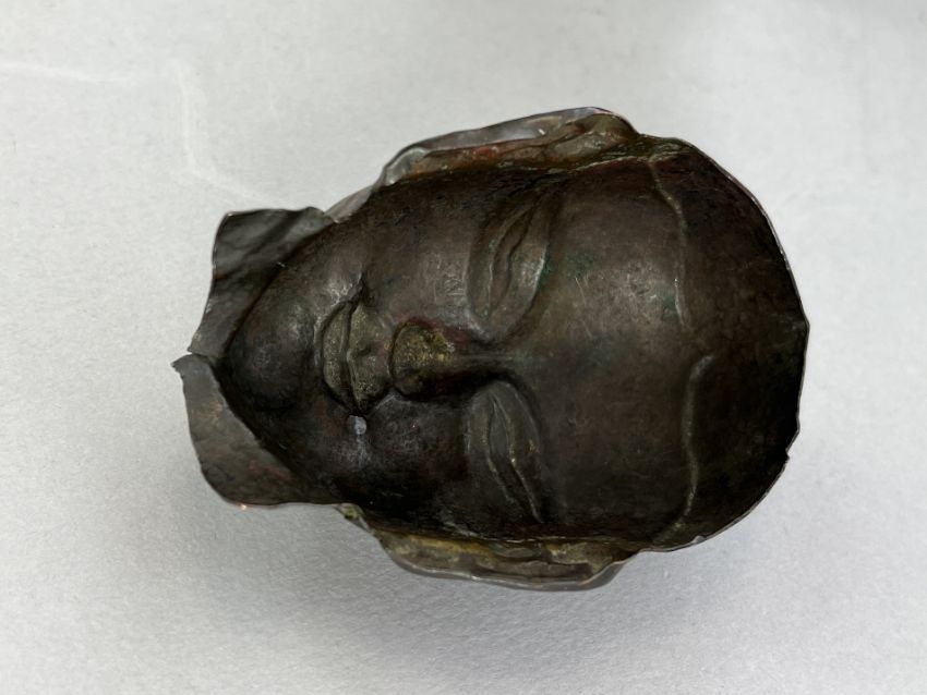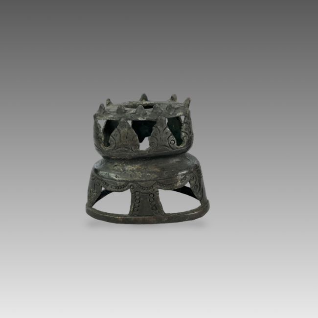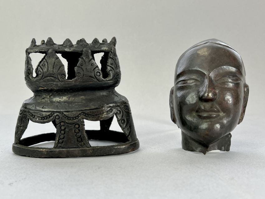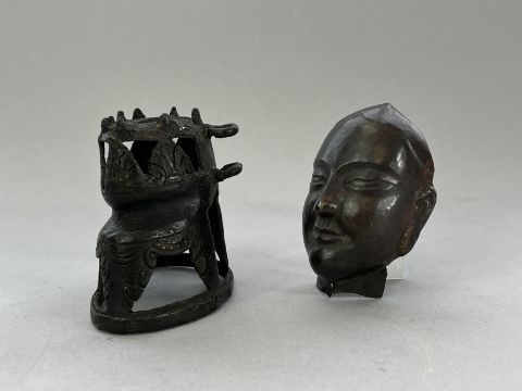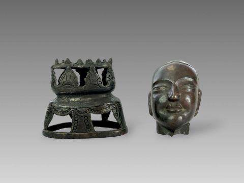 A Repousse Copper Monk's Head, and an openwork Bronze Lotus Stand, c.1800A Repousse Copper Monk's Head, and an openwork Bronze Lotus Stand, c.1800 the stand H:9cm.