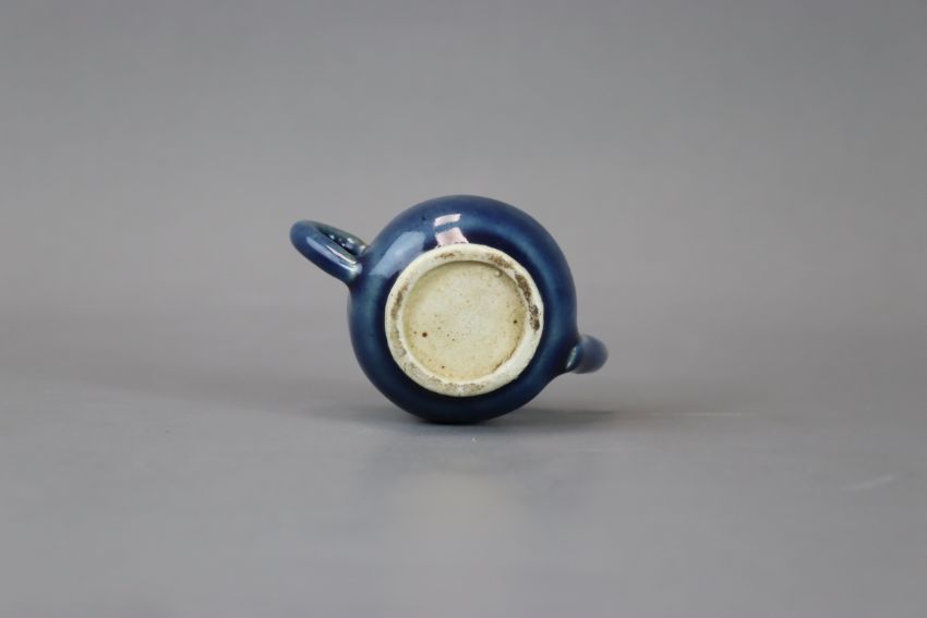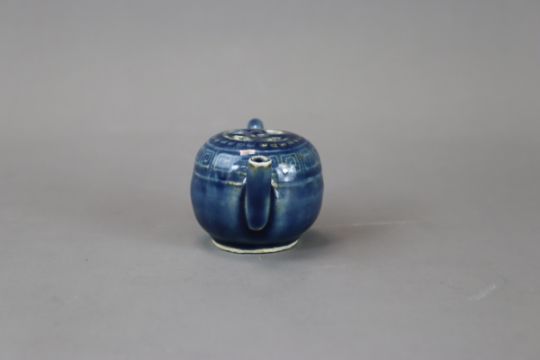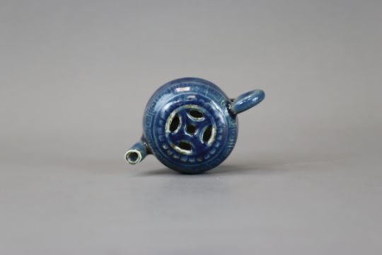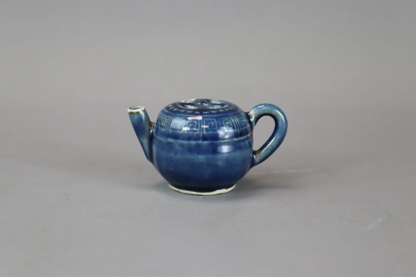 A Blue Glazed Waterdropper, Qing dynasty, of globular teapot form with a 'cash' shaped aperture at the top,