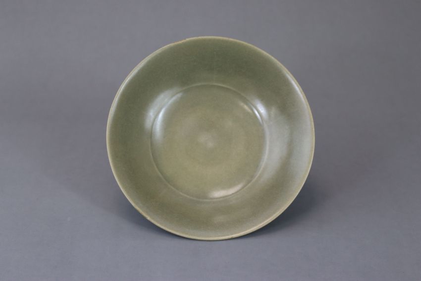 A Yaozhou Celadon Floral Dish, Song dynasty potted with angled sides??rising from a broad??base ??and short foot??to an elegantly everted??rim, the flaring shallow sides divided into six lobes by slender radial lines in slip, applied overall with matte olive-green glaze save for the unglazed footring