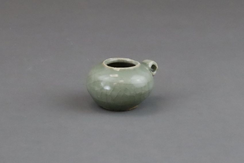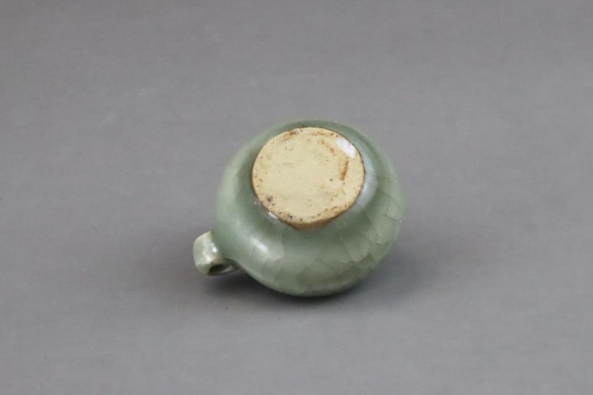 A Longquan Celadon Bird Feeder, Song dynasty of compressed globular form, set with a ring handle at one side, covered overall in a willow-green crackled glaze, stopping at the foot, unglazed flat base