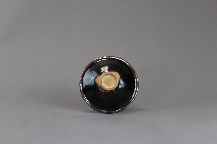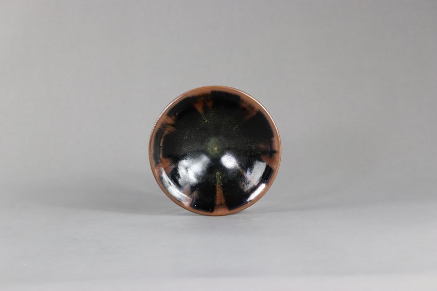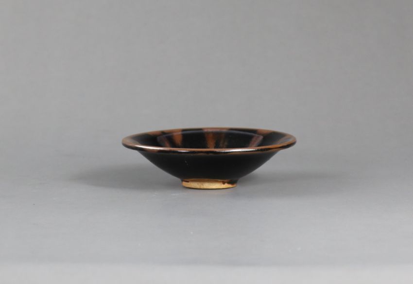 A Rare Yaozhou Russet-splashed Black-glazed Conical Bowl, Jin dynasty slightly rounded sides flaring from the small ring foot to an everted rim, interior covered with a lustrous black glaze liberally splashed in russet with mottles from the rim, foot and base left unglazed revealing the buff stoneware body