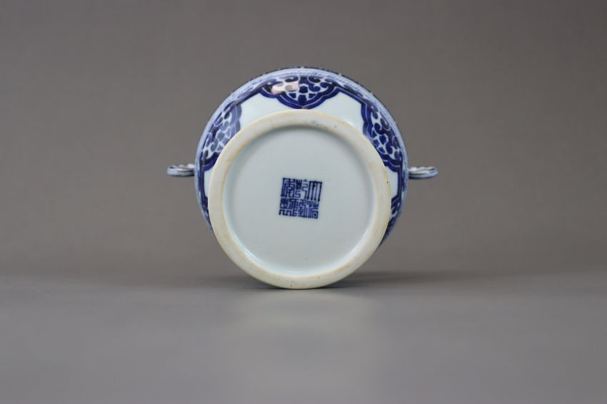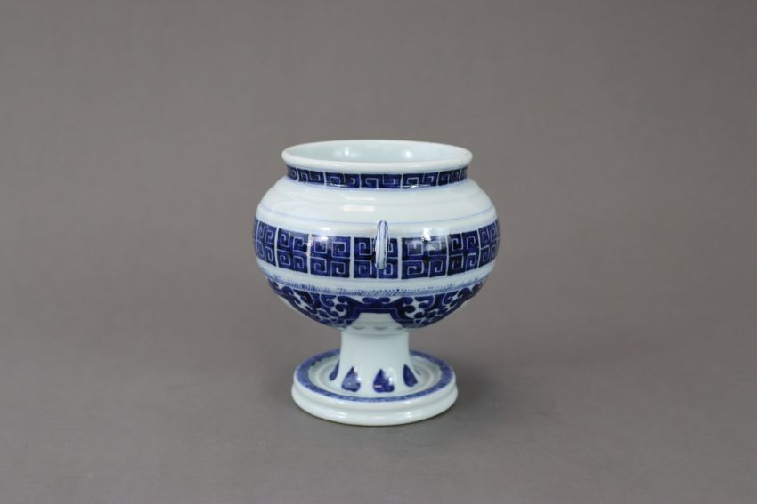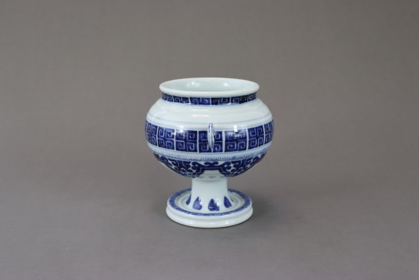 A Blue and White Globular Stembowl, seal mark of Qianlong, probably Qing dynasty, with double ring handles and with moulded line and archaistic scroll decoration,