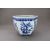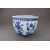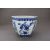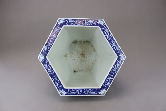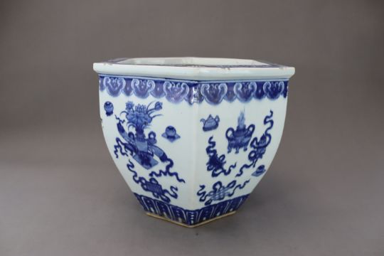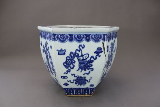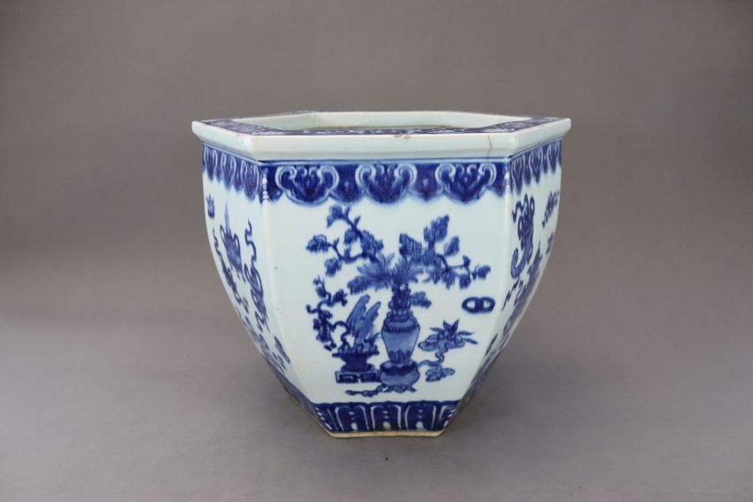 A Blue and White Hundred Antiques Jardiniere, 19th century, of hexagonal section and ovoid form, painted around the exterior in rich cobalt with precious objects, between a cloud collar border below the galleried rim and a lappet band around the foot, ??