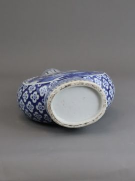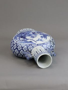 A Blue and White Moonflask with a Mythical Scene, Guangxu, well painted in good blue on both sides, with a central medallion of a warrior king riding a tiger confronting a monk on a cloud bearing a flaming Pearl , all within a blue ground florette field, the cylindrical neck with doubled entwined foliate handles
