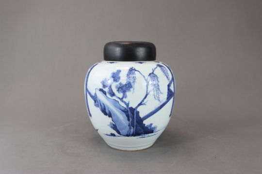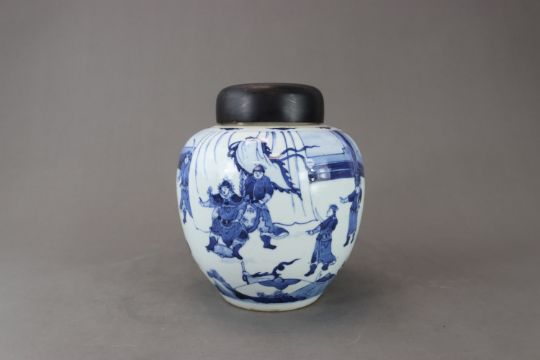 A Blue and White Ginger Jar with Figures, six character mark of Chenghua, the ovoid sides well painted in strong cobalt with a continuous scene of courtiers kneeling before a general and his retinue, wood lid,
