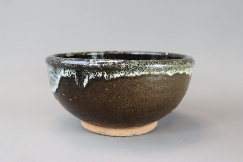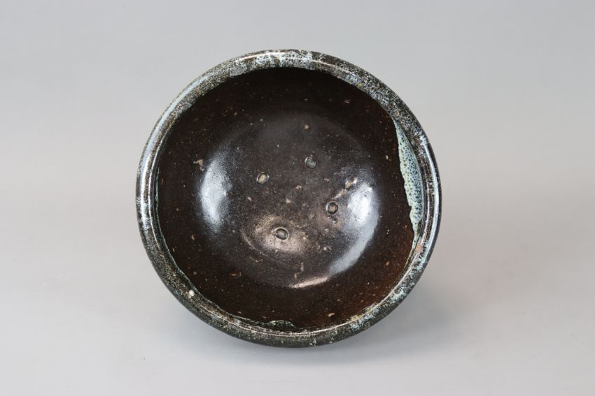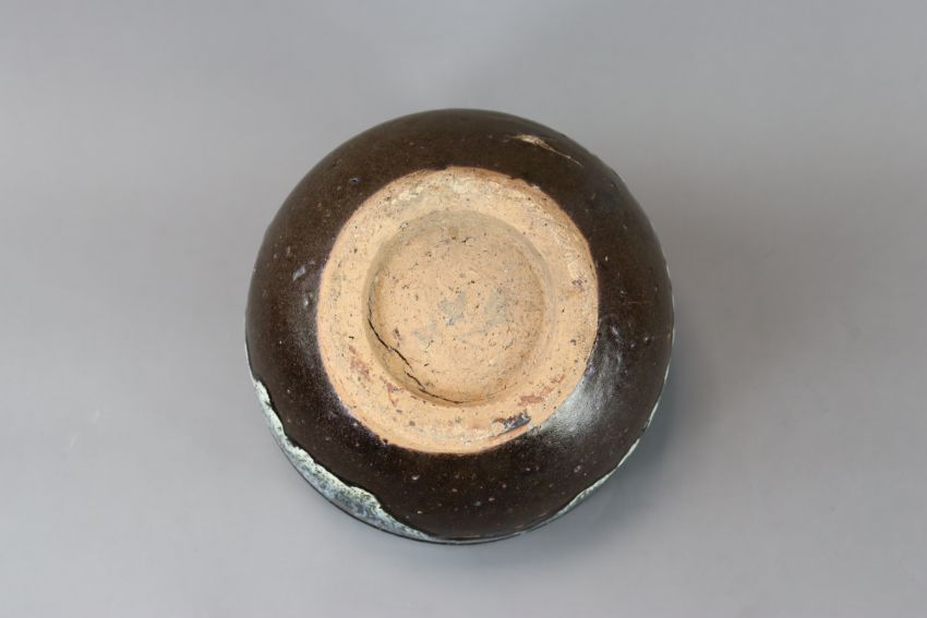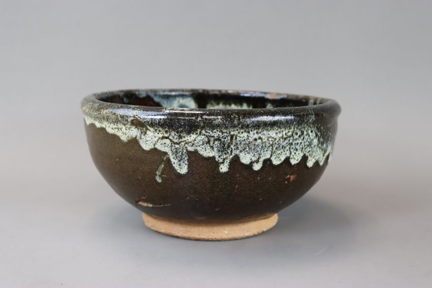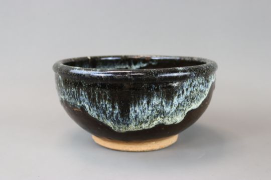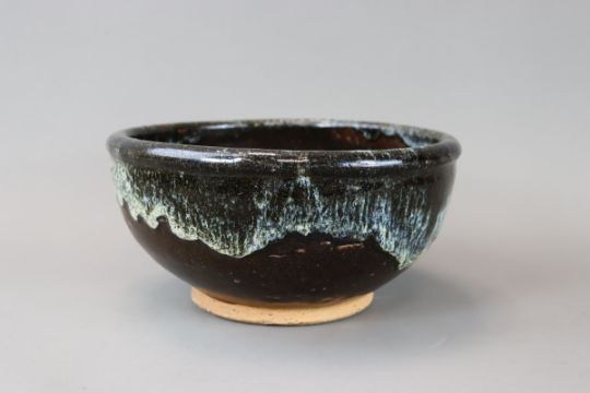 A Phosphatic-splashed Basin, Tang dynasty of rounded sides from straight foot to lipped rim, covered with a black glaze that ends evenly at the foot, the rim decorated with mottled milky-blue, three spur marks in the centre